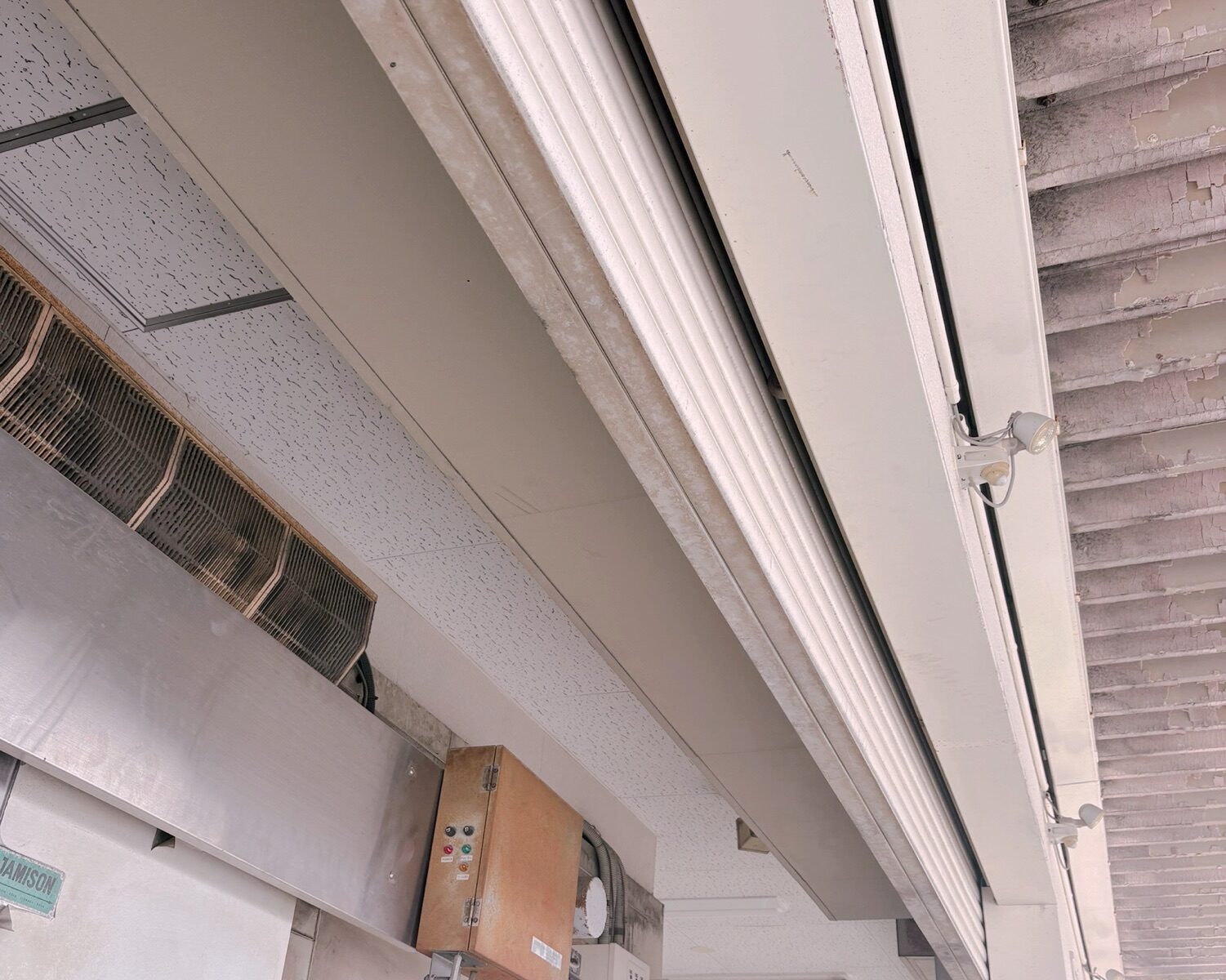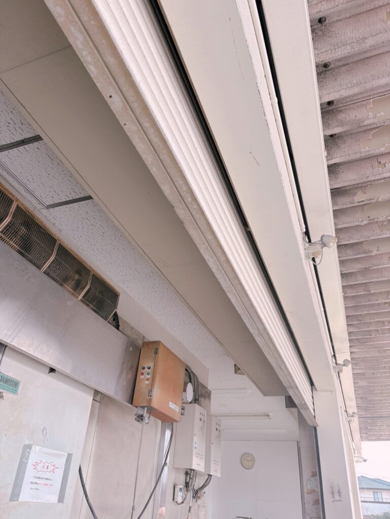 そんな中、ガシャーンと大きな音がして、何が起きたかと思ったら、何と自動シャッターが上限を超えて、挟まる様に半分埋まってしまったのです。